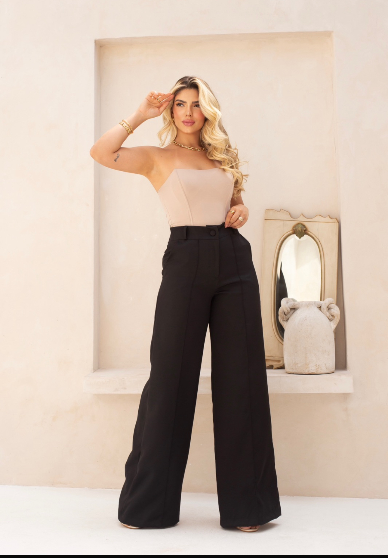 Elegância e conforto em uma só peça! A calça pantalona preta é perfeita para compor looks sofisticados e modernos. Confeccionada em tecido de alfaiataria premium, ela possui caimento leve, cintura alta e modelagem ampla que valoriza a silhueta.